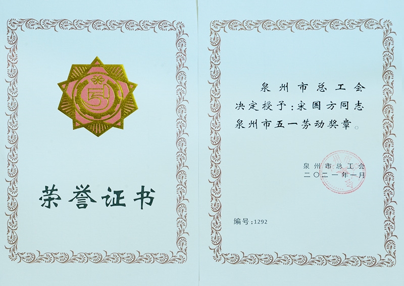 泉州工匠榮譽(yù)證書